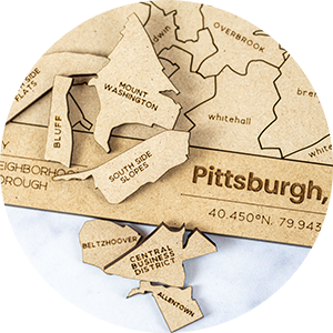 Neighborhoods & Boroughs Puzzle MapBest Gift Ever. This is far and away one of the coolest things I own. Period. If you have a Pittsburgh area geography nerd, this puzzle will let them "touch" neighborhoods and boroughs. The cut wood smells great and feels good in the hand and the puzzle is so fun to play over and over.